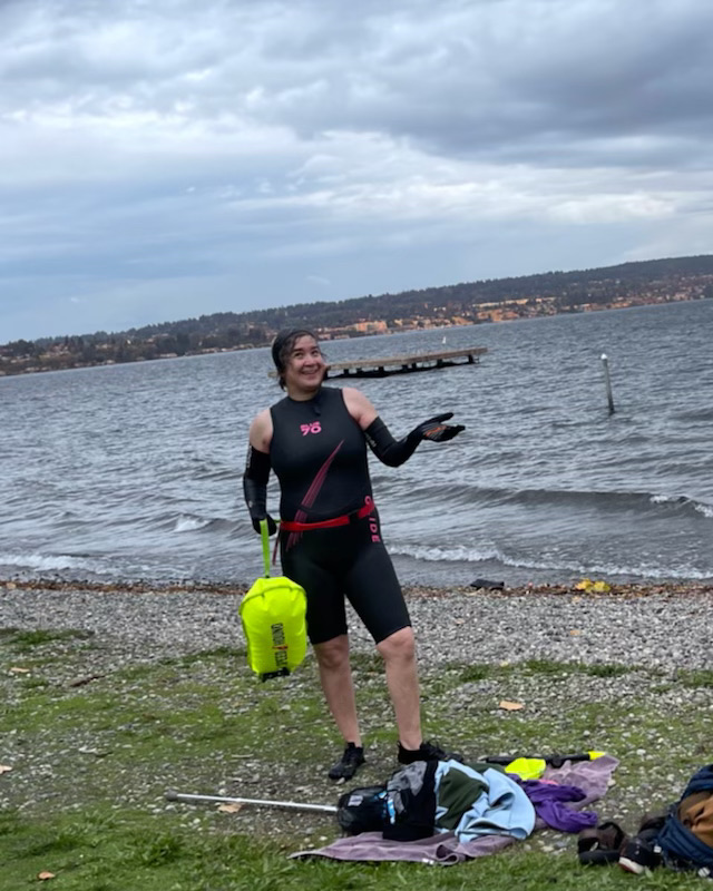 [Aside: So, here is the thing. I’m gonna share the photo with you even though I’m horrified by my appearance. I gained 50 pounds when I broke the shit out of my leg a few years ago. It’s been a very slow and arduous process trying to recover. I’m still doing PT, and my leg still hurts all the time. I’ve maybe lost eight pounds or so, but it’s really hard to lose the weight because my other health issues make it impossible for me to exercise with any intensity or regularity. I’m really struggling with severe depression and PTSD. Swimming, and especially swimming in cold water, is the first thing that has helped me feel like there are a few glimpses of light from where I am mired in a deep, dark pit.