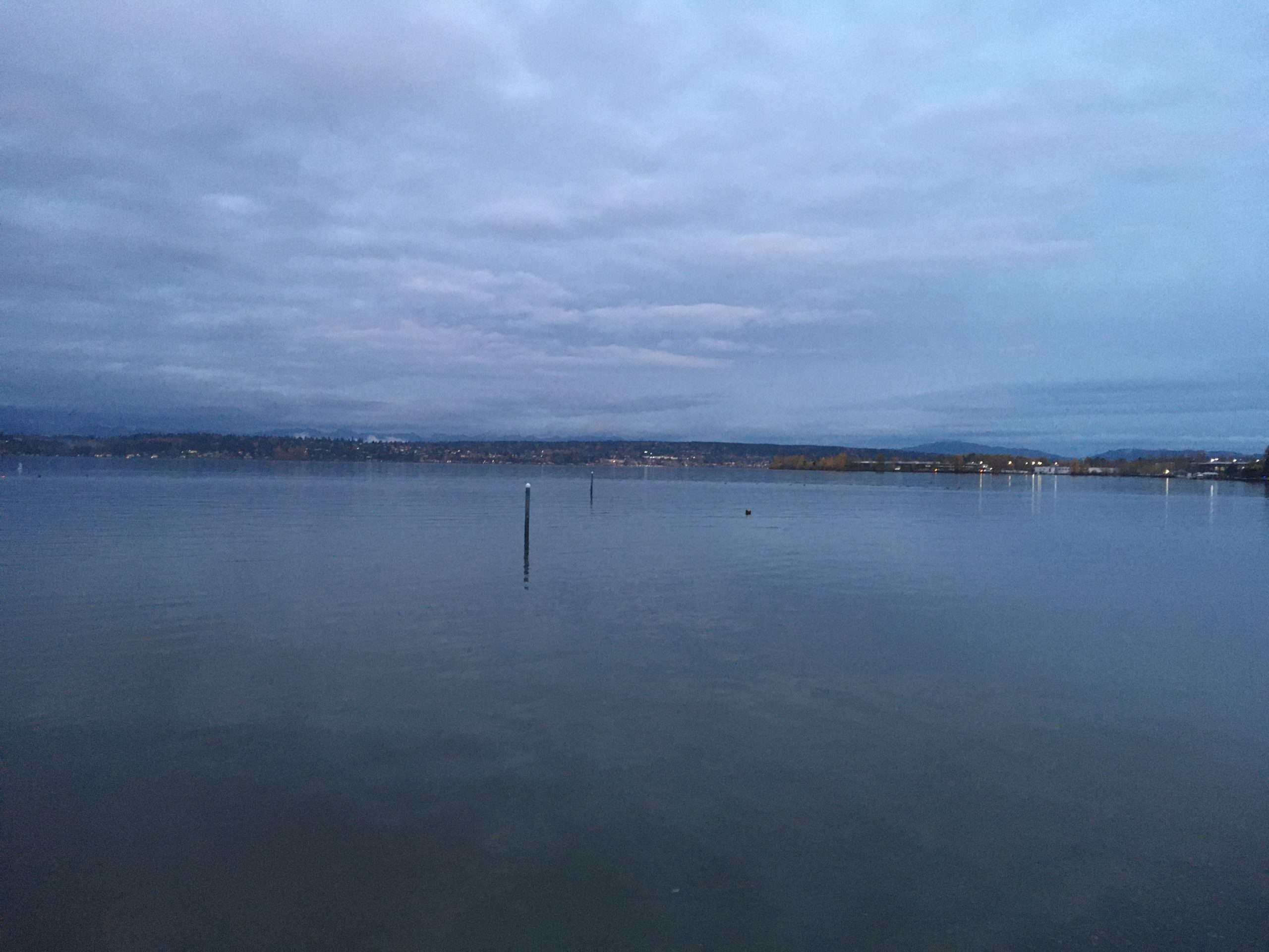 I was so happy to walk into the water. It was perfectly flat today. The mountains were out. There was a kayak lesson 200 yards away. I slid into the water and started my floppy breast stroke. My face burned from the cold, so I pulled my head out. I had to start and stop like that about six time before my face acclimated to the water. Then water was leaking through my neck and running down my back. The was a bunched up area on my left leg, and that was irritating me. I couldn’t get comfortable and find a groove with swimming or with the water. I tried treading water, but it wasn’t very interesting. I tried swimming back and forth across the shallower (but too deep for me to touch my toes to the bottom) water between two poles. I felt lonely without a swim buddy. I thought maybe I’d float, but when I grabbed my buoy it was flat. I’d forgotten to blow it up. I’d also had to put my phone in there sans protective case because the case broke when I was trying to seal it. I paddled to where I could stand up, then blew up the buoy so I’d have a floaty.