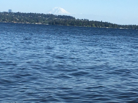 I continued swimming south, then veered east. I hung out in the deep water for awhile, jogging in place. I did this in college when I was injured. My coach would put me in a neoprene onesie, tie rubber tubing around my waist, then have me run in the water against resistance. It would have been much better with a full wetsuit. I love the buoyancy. It’s magic to be vertical in the water, especially if I don’t want to put much effort into holding my position. I love having just my head above the water, looking at the various points on the horizon where I can see the Cascade Mountains, the sail boats on the other side of the lake, all the fancy houses on the waterfront.