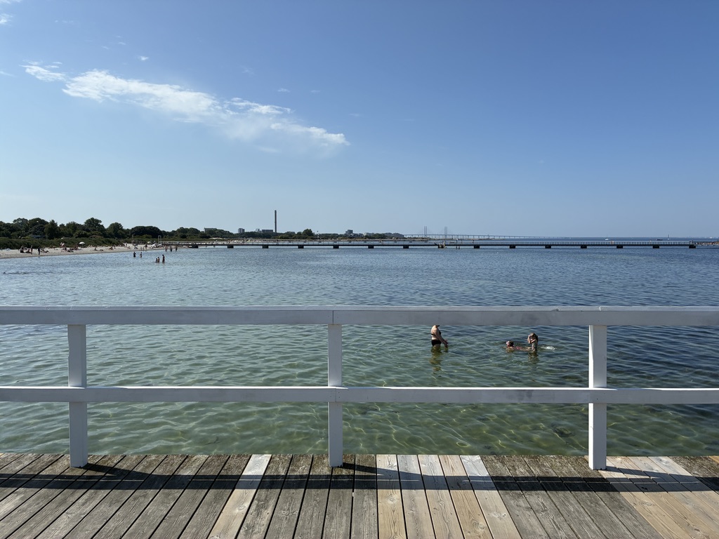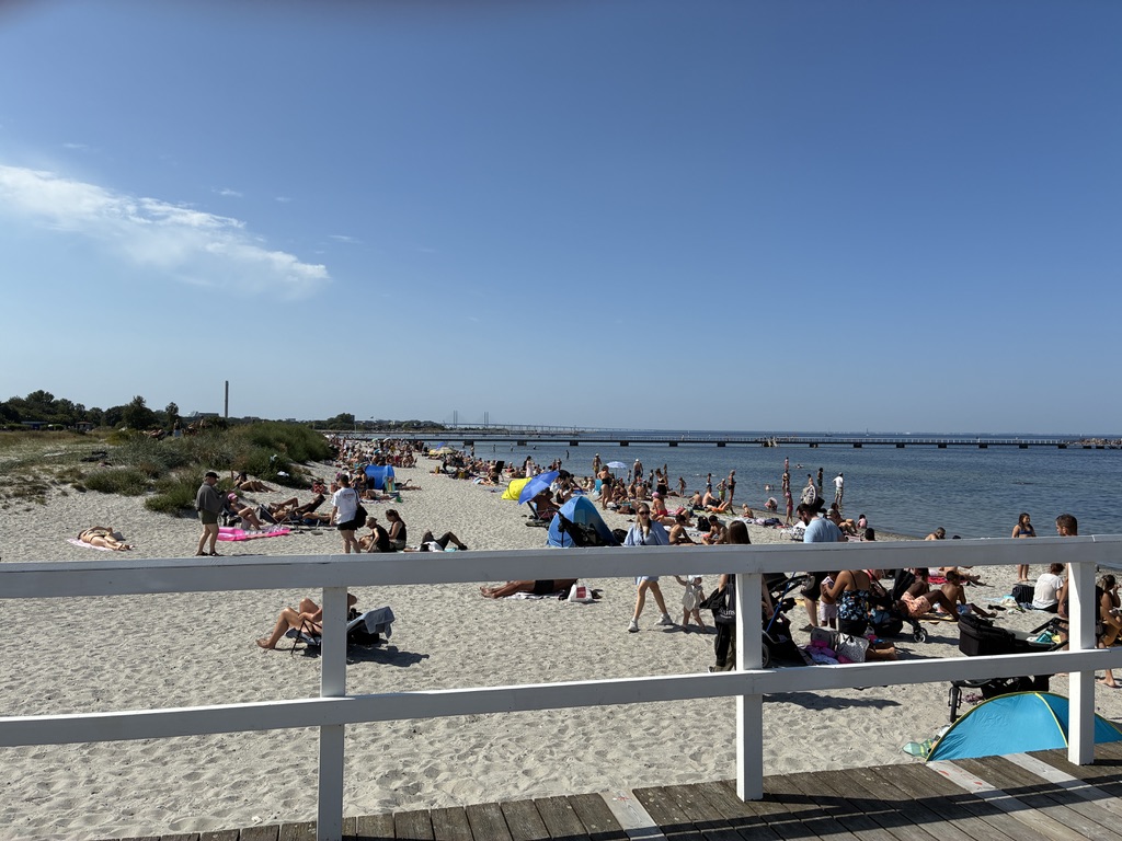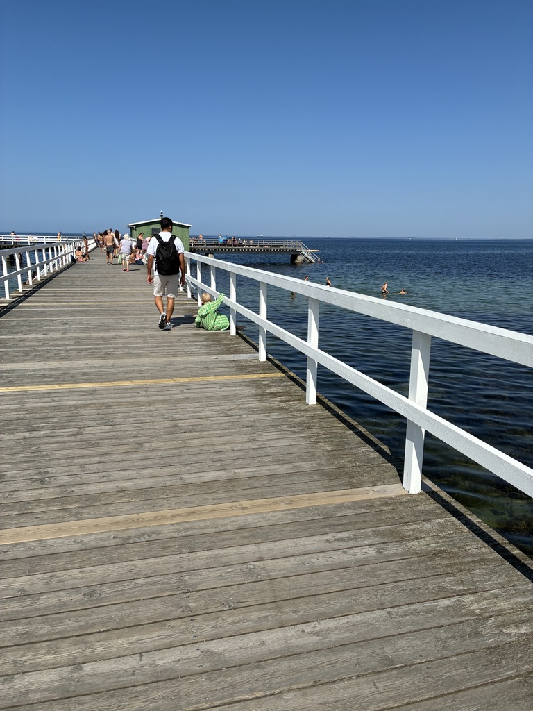 This time I cycled to the pier in the middle so I could swim to either side and reach another pier. The beach was full of people but not packed. And not really noisy. Somehow everyone was enjoying the sand and sea without intruding on each other. The only noise was little kids shouting to each other across the water and squealing with delight as they splashed around or played on their floatable.