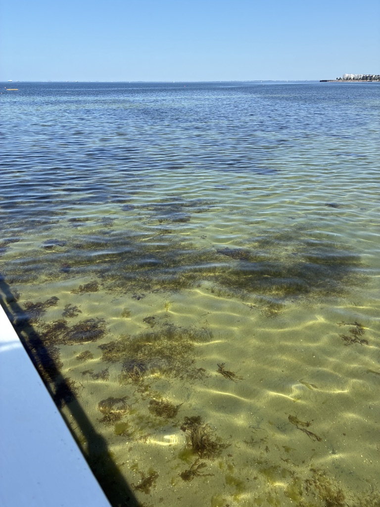 I adjusted my goggles and started swimming to the other pier. I figured it would take 30 minutes to get there and back. Along the way I marveled at the various shapes, sizes, and colors of the sea plants. I hoped I’d see a fish, but instead I saw several moon jellies. Most of them where pretty small, maybe the size of a golf ball, but a few were bigger, more like the size of an orange. The moon jellies are fascinating because they look so delicate. Last time I was here I only saw them in the opaque brackish water, and memory had them shaped as buns. Today, I could see that they don’t have bottoms, just tops. They’re more like a frisbee disc, concave.