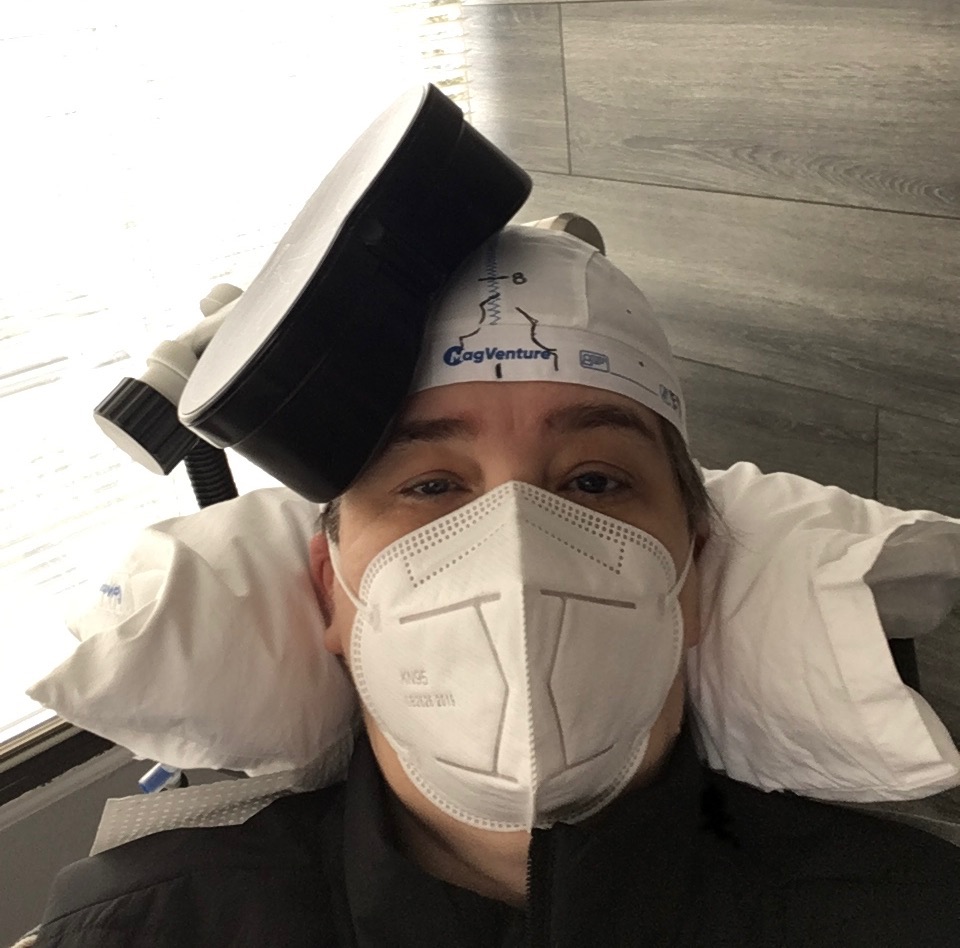 The treatment is TMS, transcranial magnetic stimulation. The idea is to send impulse into the brain to disrupt whatever is going on so that new connections get made. I’m in for 36 treatments, every day M-F for six weeks.