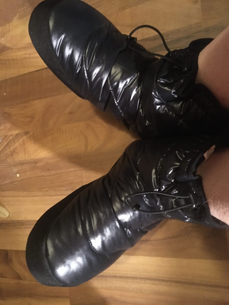 Today I am testing some insulated booties from Outdoor Research. I will post the review on my other site in a few days. So I am happily bundling in my sleeping bag, a warm flannel shirt, my fav fleece KÜHL hat, and these booties. My feet are warm and happy.
