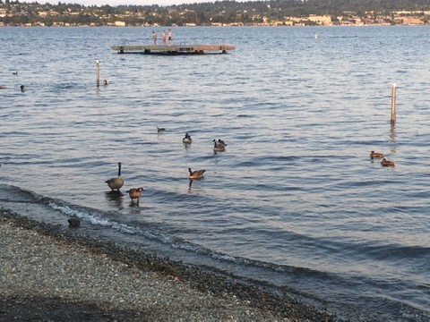 The milfoil and other weeds are floating in the lake. The duck and geese have been displaced, although they were out in force today, paddling in the shallow water. The beach has a green line of weeds that have bunched and collected, washed onto the rocks by the wakes from big boats. The shower area is muddy and dirty. The garbage cans are overflowing.