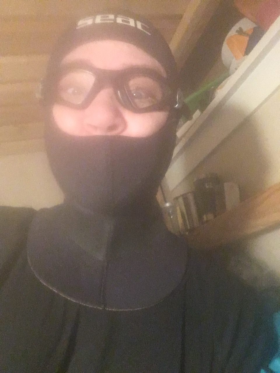 C wears a neoprene jacket over a farmer Jane type wetsuit, but the jacket is too big so it’s not as effective as it should be. My suit is snug and does a great job of insulating me from the water. Until I swim, then it leaks a bit.