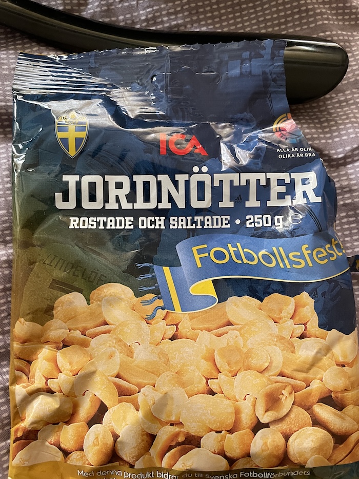 Now I’m rambling. I had the option of buying regular peanuts or peanuts with the Swedish soccer logo on them. Guess which ones I bought? The soccer peanuts, of course. I mean football peanuts. Why? Because they have the same little signs here where it shows the price per ounce/gram, and the football peanuts were cheaper! I’m learning.