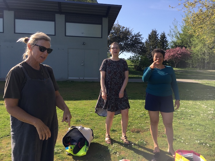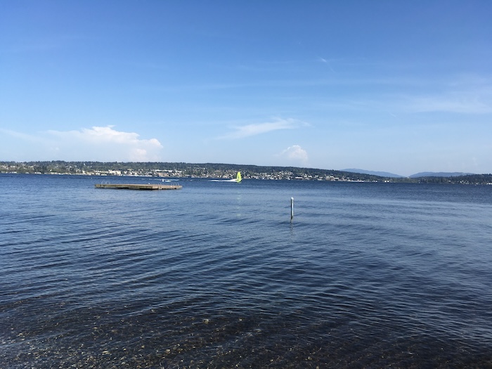 The park was buzzing with people walking dogs, playing soccer on the grass, hanging around in hammocks, sunbathing on the beach. Lots of windsurfers, which kind of sucked because one of them glided right through the swim area and could have hit one of us. Dick.
