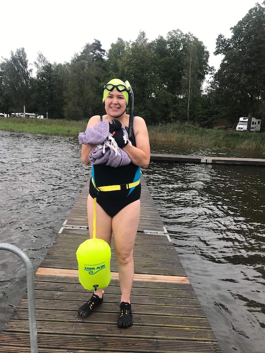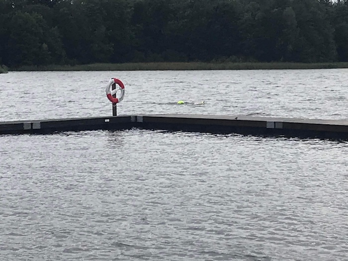 There was a U-shaped dock made of floating segments of wooden plank platforms. They moved with the water, but I didn’t feel unsteady. We got to the entry place, and there was a ladder leading into the water. I love that. I’m not into jumping in anymore after my accident. I’m too afraid of my leg. I also have a swim buoy on. Too tired to remove it.