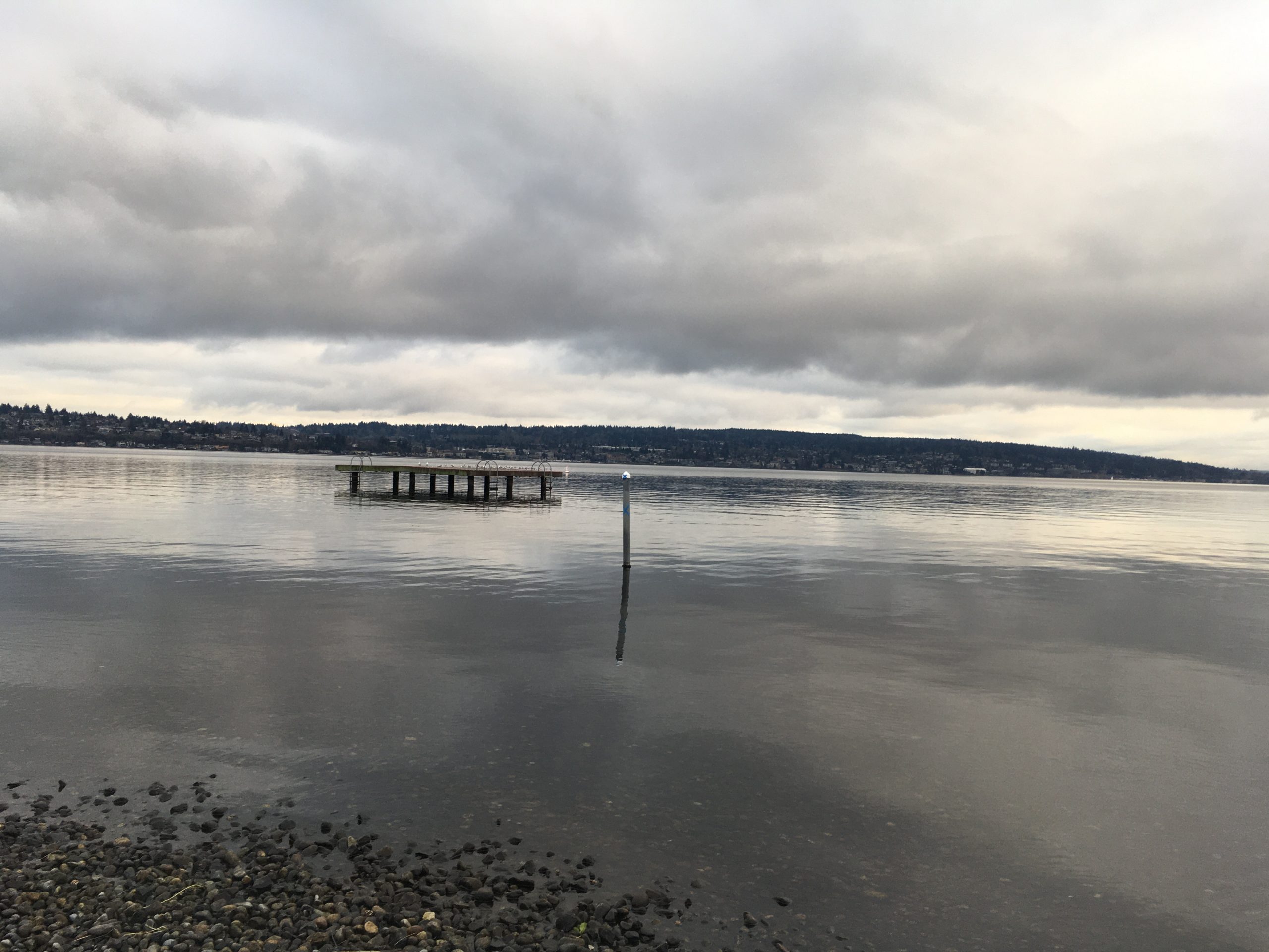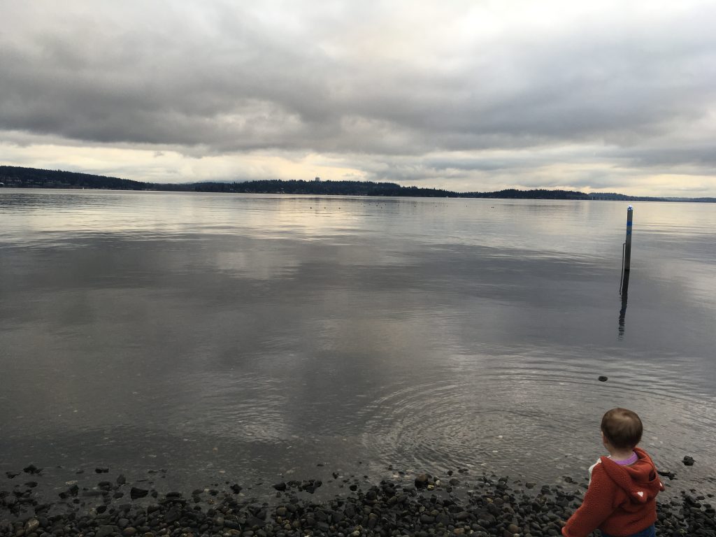 Today at the lake it was grey, and I was alone. My swim buddy wasn’t feeling well, so I decided to go by myself. I was lucky to find a man and his tiny two-year-old daughter at the water’s edge, throwing rocks into the lake. Of course, I had to say hi and comment on the darling tiny orange boots.